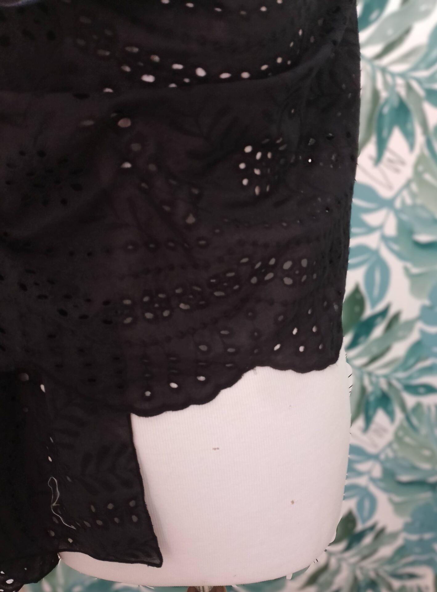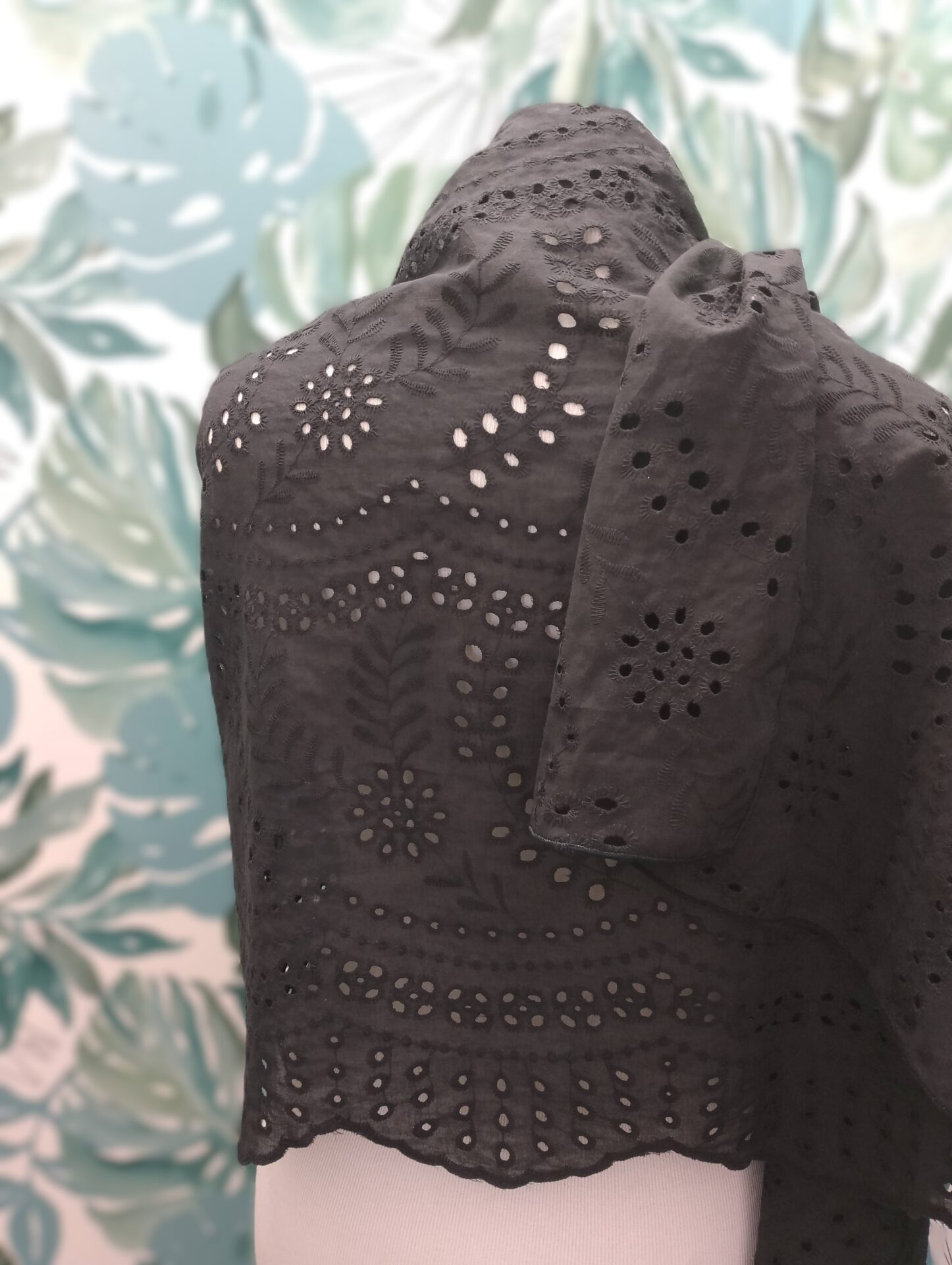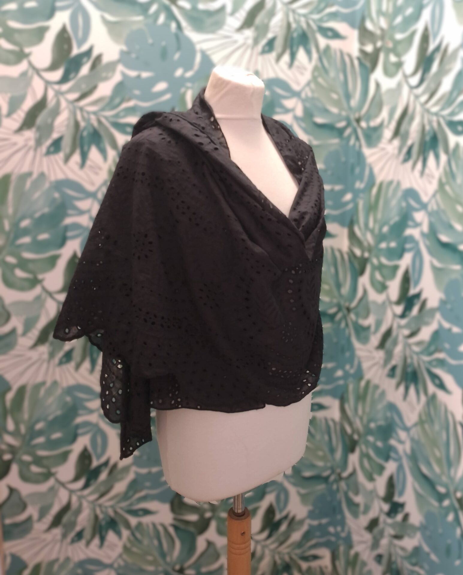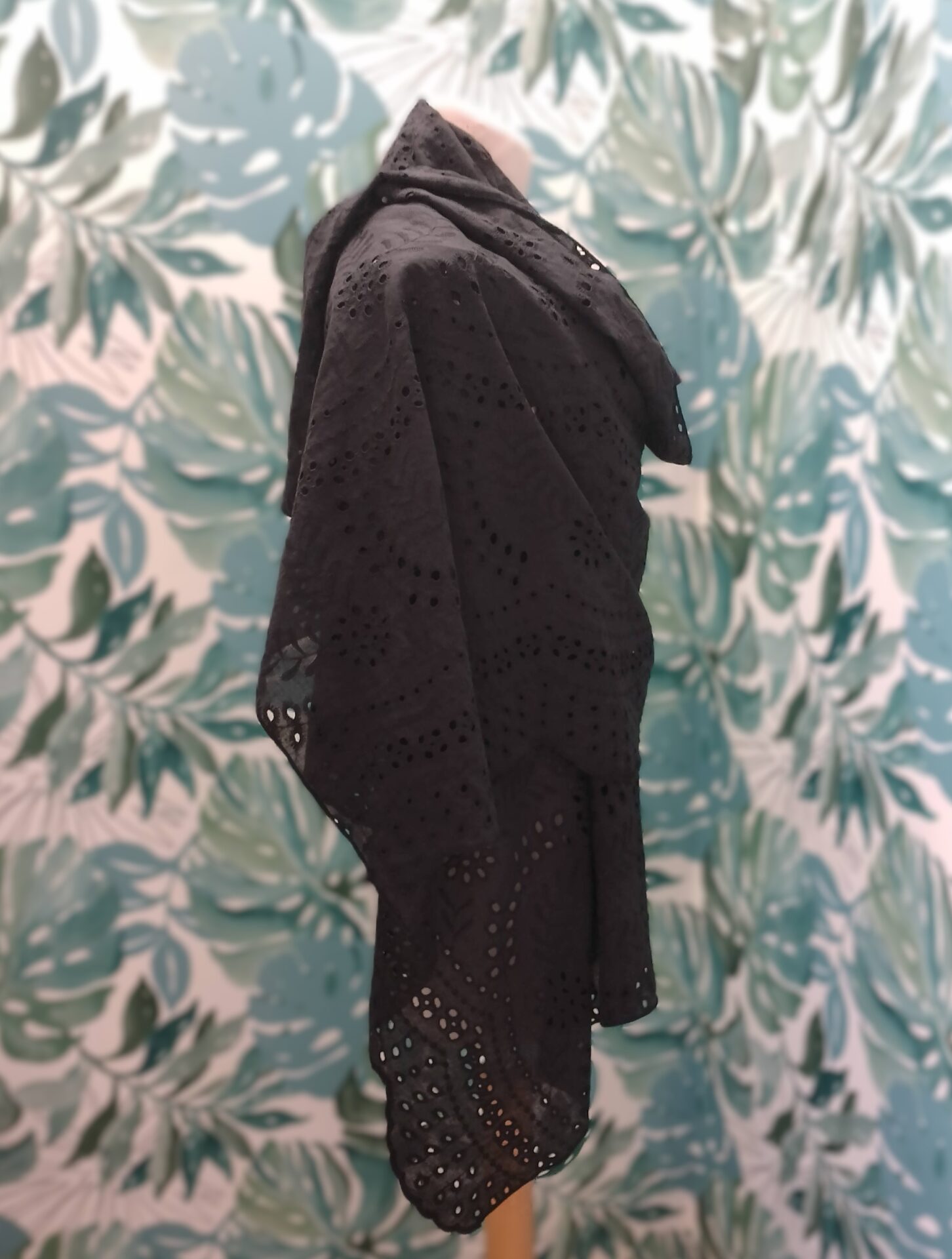 Singulière et élégante, cette étole noire en broderie anglaise est le parfait accessoire mariage pour sublimer une tenue avec caractère. Confectionnée à partir de coton 100 % issu d’un stock dormant, elle valorise la mode circulaire tout en apportant une finition soignée et raffinée.